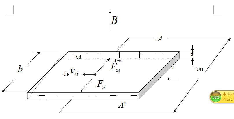 所謂霍爾效應(yīng):相當(dāng)于把一塊寬為b,厚為d的導(dǎo)電板放在磁感應(yīng)強(qiáng)度為B的磁場中,并在導(dǎo)電板中通以縱向電流I ,此時在板的橫向兩側(cè)面A、A′,之間就呈現(xiàn)出一定的電勢差,這一現(xiàn)象稱為霍爾效應(yīng),所產(chǎn)生的電勢差UH稱霍爾電壓。高斯計就是利用這一原理來測量磁場強(qiáng)度的。如圖所示: